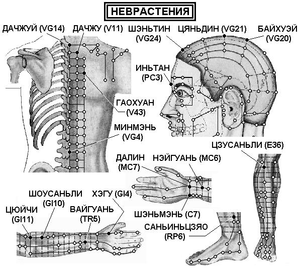 Рука TR5 Вай-гуань на 2 цуня выше тыльной лучезапястной складки, между лучевой и локтевой костями. MC6 Нэй-гуань на 2 цуня выше лучезапястной складки, между сухожилиями длинной ладонной мышцы и лучевого сгибателя запястья. Используют точку при разогнутой в локтевом суставе руке и обращенной кверху ладони. MC7 Да-лин посередине лучезапястной складки, между сухожилиями длинной ладонной мышцы и лучевого сгибателя запястья. Используют точку при обращенной кверху ладони. C7 Шэнь-мэнь у локтевого края проксимальной лучезапястной складки, у лучевого края сухожилия локтевого сгибателя запястья, в щели между гороховидной и локтевой костями. GI4 Хэ-гу на тыле кисти между I и II пястными костями, приблизительно в середине лучевого края II пястной кости. GI10 Шоу-сань-ли на линии, соединяющей точки Ян-си GI.5 и Цюй-чи GI.11, на 2 цуня ниже точки Цюй-чи GI.11. GI11 Цюй-чи при согнутой в локтевом суставе руке в углублении у лучевого края локтевой складки.
