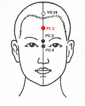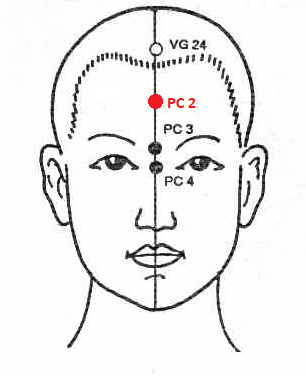 на средней линии лба, выше PC3 ИНЬ-ТАН на отрезок равный расстоянию от внутреннего до наружного угла глаза, на середине расстояния между PC3 и VG24