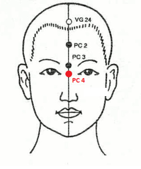 на середине линии, соединяющей внутренние углы глаз, в центре переносицы.![]() | ||||||