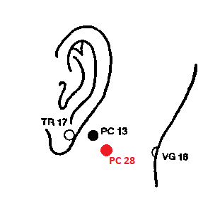РС28 ФЭН-ЯНЬ —на 0,5 и.ц. кпереди от середины линии, соединяющей нижний край мочки уха и VС 16 ФЭН-ФУ Точка находятся кзади и книзу от РС 13 И-МИН.