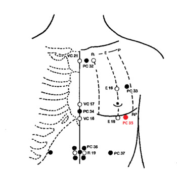 РС35 ЦЗО-И (слева), ЮЙ (справа) — в пятом межреберье на 1 п. ц. латеральнее среднеключичной линии, Е18 ЖУ-ГЭНЬ