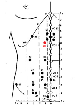 РС38 ШИ-ГУАНЬ - на 1 п. ц. латеральнее VС 11 ЦЗЯНЬ-ЛИ (VС 11 расположена на 3 п. и выше пупка)