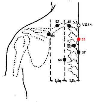 РС55 ЭР-ЧЖУЙ-СЯ (У-МИН-СЮЕ. СИНЬ-ШУ) — в углублении, под остистым отростком 2-го грудного позвонка![]() | ||||||