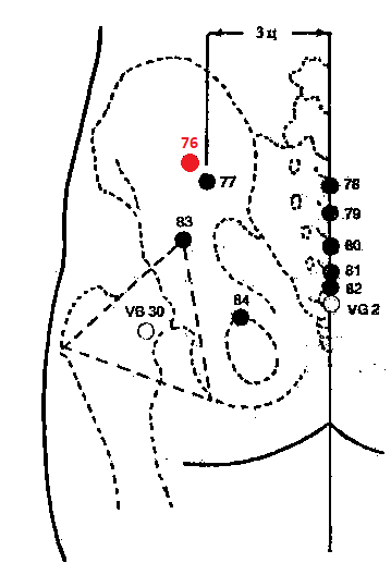 РС76 ЧЖУН-КУН - на 3,5 п. ц. латеральнее нижнего края остистого отростка 5-го поясничного позвонка ![]() | ||||||