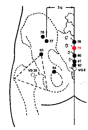 РС79 ЯО-ЦИ — под остистым отростком 2-го крестцового позвонка.