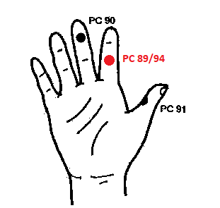 РС89 ФЭН-ГУАНЬ - на ладонной поверхности 2-го пальца, в середине проксимальной поперечной межфаланговой складки (совпадает с точкой РС 94 2-го пальца) ![]() | ||||||
