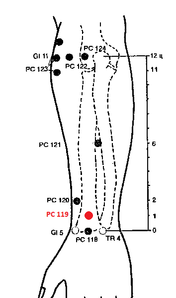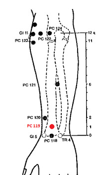 РС119 ЦУНЬ-ПИН — на тыльной стороне запястья на 1 п. ц. проксимальнее и на 0,5 и ц. радиальнее середины лучезапястной складки, на 1 п. ц. выше РС 118 ЧЖУН-ЦЮАНЪ