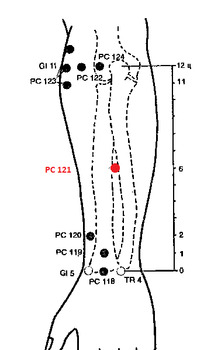 РС121 ЧИ-ЖАО — на тыльной поверхности предплечья, между локтевой и лучевой костями, на 6 п. ц. выше середины складки лучезапястного сустава