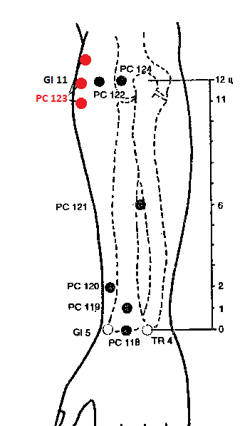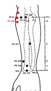 РС123 САНЬ-ЧИ - 3 точки - одна GI 11 ЦЮЙ-ЧИ, две другие —на 1п.ц. выше и ниже GI11 ЦЮЙ ЧИ