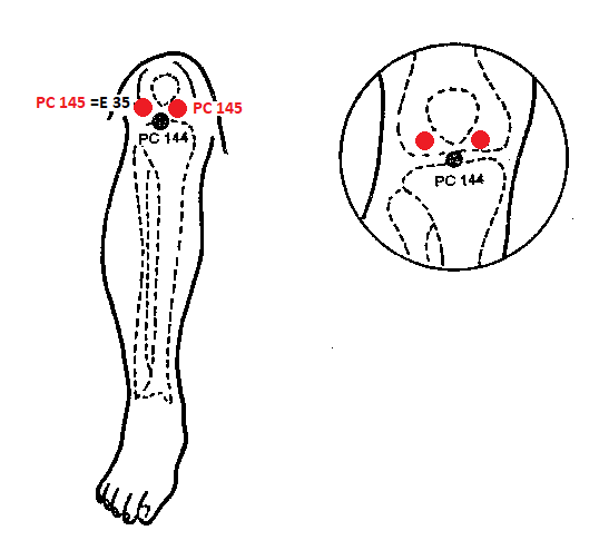 РС145 СИ-ЯНЬ - 2 точки в углублении с обеих сторон от верхушки надколенной чашечки Точка, расположенная латерально, совпадает с локализацией Е 35 ДУ-БИ