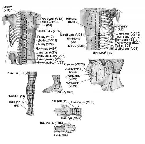 VB24 Жи-юэ прямо вниз от соска, в VII межреберном промежутке, на 1 ребро прямо вниз от точки Ци-мэнь F.14.