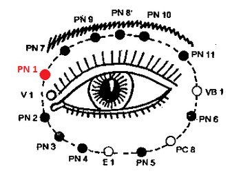 PN 1 ШАН-ЦИН-МИН (НЕЙ-МИН) - на 0,5 см выше и кнутри от точки V 1 ЦИН-МИН, на верхнем крае орбиты (рис. 224).