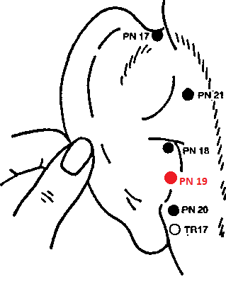 PN 19 ХОУ-ТИН-СЮЕ (ЧЖИ-ЛУН-СИНЬ-ХАО) — на середине расстояния между точками PN 18 и PN 20, на уровне точки PN13 ТИН-СЮЕ | ||||||