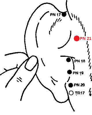PN 21 ХОУ-ЦЗУН (ЧЖИ-ЛУН-СИНЬ-ЦИ-ХАО) — при отогнутой кпереди ушной раковине точка находится несколько выше складки позади уха. Расположена на середине расстояния между основанием ушной раковины и задней границей роста волос | ||||||