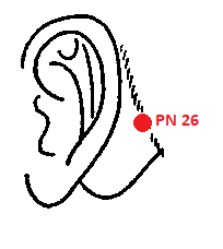 PN 26 ЯНЬ-ЧИ — точка находится позади уха, в месте пересечения горизонтальной линии, проведенной через наиболее выступающую часть сосцевидного отростка, с вертикальной линией границы волос