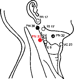 PN 31 ЦЯН-ИН — на 2 и.ц. латеральнее передней срединной линии шеи, на уровне VC 23 ЛЯНЬ-ЦЮАНЬ, на 0,5 и.ц. кзади и кверху от Е 9 ЖЭНЬ-ИН