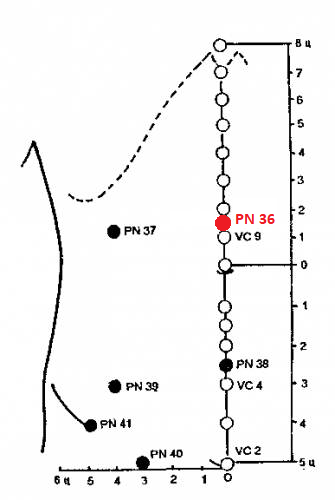 PN 36 ШУЙ-ШАН (ЦЗИ-СИНЬ) — на средней линии живота, на 1,5 и.ц. выше пупка