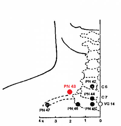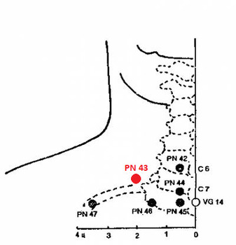 PN 43 СЮЕ-ДЯНЬ — на 2 п.ц. латеральнее нижнего края остистого отростка 6-го шейного позвонка