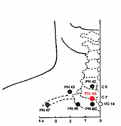 PN 44 ЦИ-ЦЗИН-ЧЖУЙ-ПАН — на 0,5 п.ц. кнаружи от остистого отростка 7-го шейного позвонка