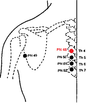PN 48 ВЭЙ-ЖЕ-СЮЕ — на 0,5 п.ц. латеральнее нижнего края остистого отростка 4-го грудного позвонка (совпадает с 4-й точкой PC 85)