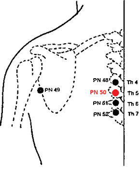 PN 50 ЧЖУН-ЧУАН (PN 49) — на 0,5 п.ц. кнаружи от нижнего края остистого отростка 5-го грудного позвонка (совпадает с 5-й точкой PC 85)