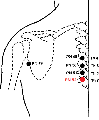 PN 52 ШЕНЬ-ЖЕ-СЮЕ - на 0,5 п.ц. лате-рально от нижнего края остистого отростка 7-го грудного позвонка (совпадает с 7-й точкой PC 85)