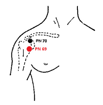 PN 69 ЦЗЮЙ-БИ — на передней поверхности плечевого сустава, на 3,5 и.ц. ниже акромиально-ключичного сочленения, над передней подмышечной складкой, на 2 и.ц. ниже PN 70 ТАЙ-ЦЗЯНЬ | ||||||