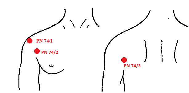 PN 74 ЯН-САН-ЧЕН - 3 точки: PN 74/ 1 — идентичная GI 15 ЦЗЯНЬ-ЮЙ; PN 74/ 2 — ЦЗЯНЬ-ЧИ — передняя плечевая точка — находится на 1 и. ц. выше переднего края подмышечной складки; PN 74/ 3 — ЦЗЯНЬ-ХУ — задняя плечевая точка — находится на 1,5 и.ц. выше заднего края подмышечной складки | ||||||