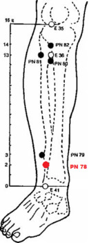 PN 78 НАО-ЦИН (ЦЗУ-СЯ-ЧУЙ-ДЯНЬ, ШАН-ЦЗЕ-СИ) — на 2 п.ц. выше Е 41 ЦЗЕ-СИ, на наружном крае большеберцовой кости