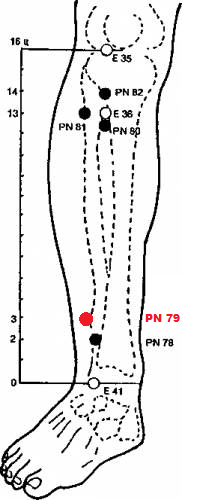 PN 79 ЦЗИН-СЯ — на 3 п.ц. выше Е 41 ЦЗЕ-СИ и на 1 И.Ц. латеральнее от наружного края большеберцовой кости