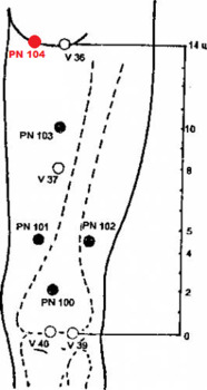 PN 104 ИНЬ-КАН — на ягодице, на 1,5 и.ц. кнутри от V 36 ЧЭН-ФУ